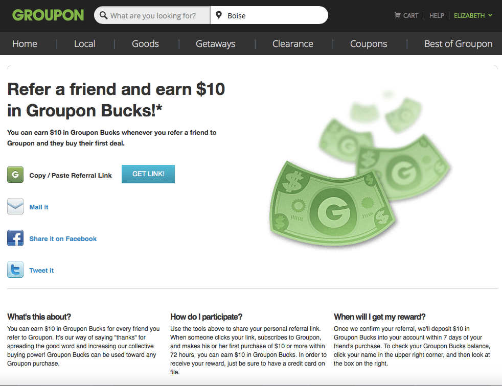 Por cada amigo que refieras, recibirás 10 dólares en dólares de Groupon cuando hagan su primera compra. Sólo tienes que iniciar sesión y hacer clic en tu nombre en la esquina superior, y luego hacer clic en “recomendar a un amigo” en el menú desplegable. Una forma rápida y sencilla de hacer sus compras en Groupon aún más baratas!
